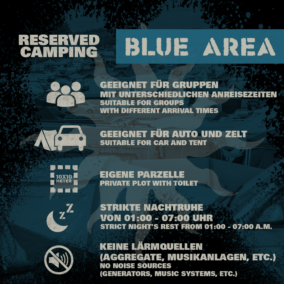 Als Gruppe habt ihr die Möglichkeit in der BLUE AREA eine Fläche zu reservieren, um eure Anreise einfacher koordinieren zu können.